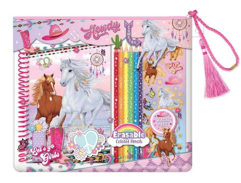 Zestaw zawiera: - gruby kołozeszyt w linie - 6 kolorowych wymazywalnych kredek ołówkowych - arkusz naklejek - 3 wzory karteczek samoprzylepnych - dekoracyjna taśma klejąca Zestaw zapakowany w ozdobną saszetkę zamykaną na zamek z uchwytem do wygodnego przenoszenia. Wiek: 5+