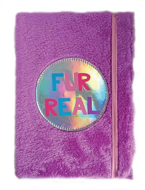 Notatnik ma króciutkie, fioletowe futerko. Na środku okładki znajduje się mieniący metalicznie okrąg z napisem „FUR REAL”. Wygodna gumka zabezpiecza notatnik przed przypadkowym otwarciem.