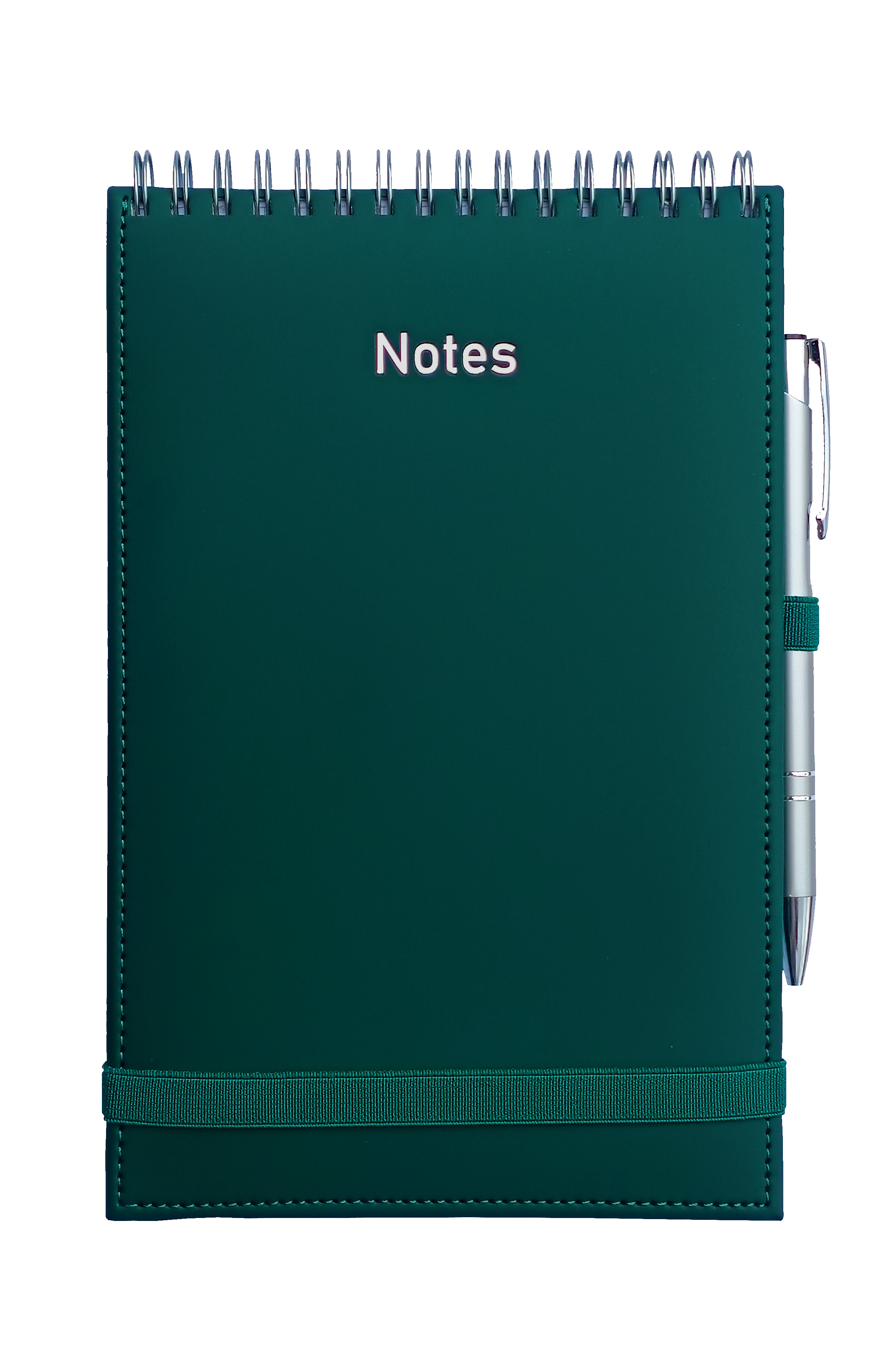 Notes A5 w oprawie Vivella ze spiralą po krótszym boku, gumka zamykająca i gumka na długopis w kolorze okładki, papier biały 70g/m2 w linię, ilość stron 160, napis "notes" SigmaChrom.