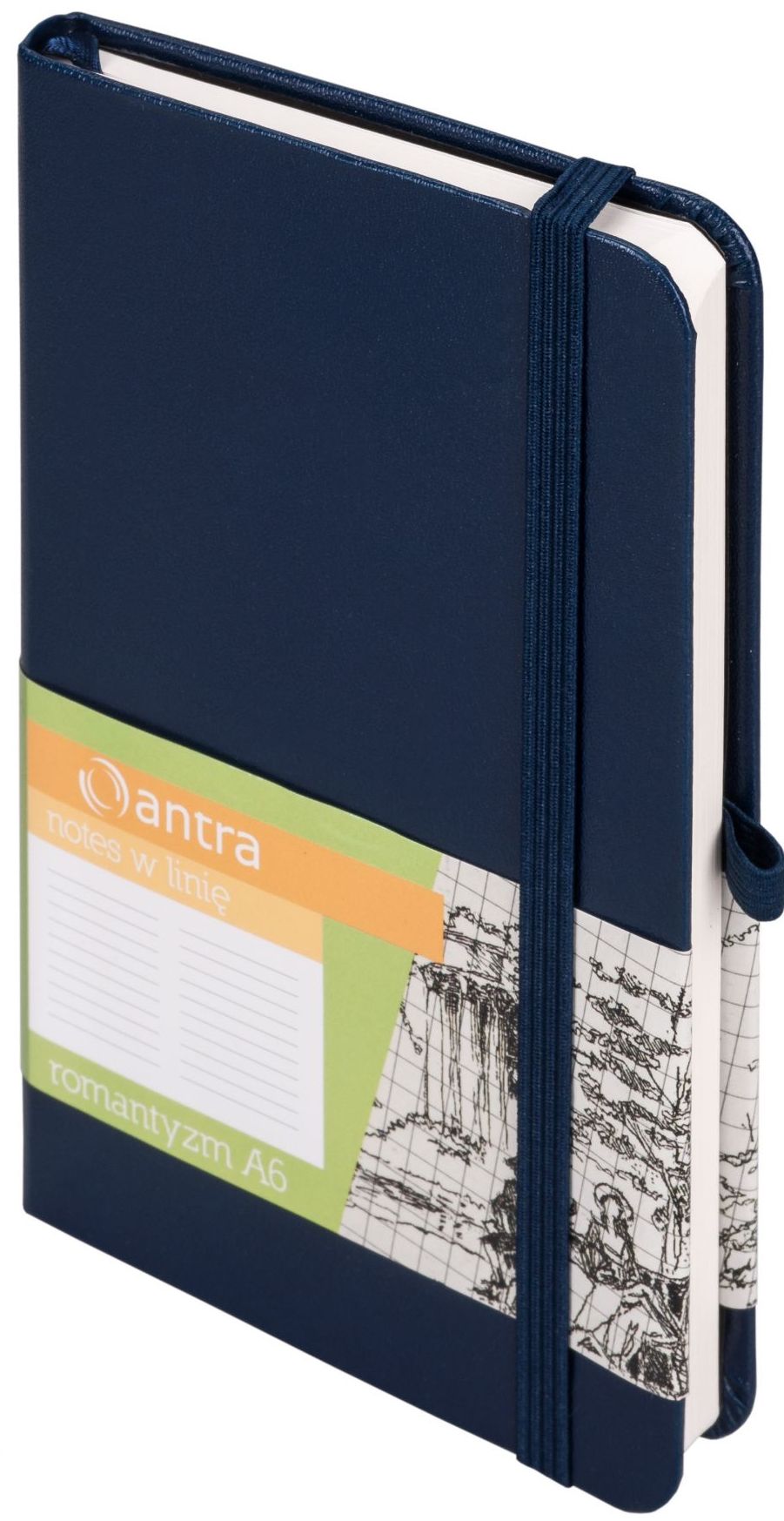 Wstążka, gumka zamykająca i szlufka na długopis w kolorze okładki.