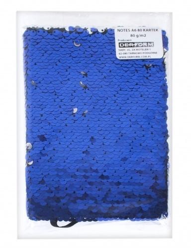 Notes w formacie A6, okładka ozdobna wykonana jest ze sztywnej tektury, zdobionej dwukolorowymi cekinami. Ulkład cekinów umożliwia zmianę ich położenia co daje bardzo ciekawe efekty. Karteczki w notesie w kolorze białym z nadrukowanymi kropeczkami co ułatwia pisanie w lini prostej.
