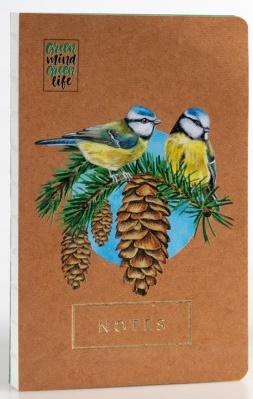 Gustowny notes ekologiczny Green Life. Notatnik z tekturową okładką pochodzącą z recyklingu i okładkową ilustracją sikorek w gnieździe.