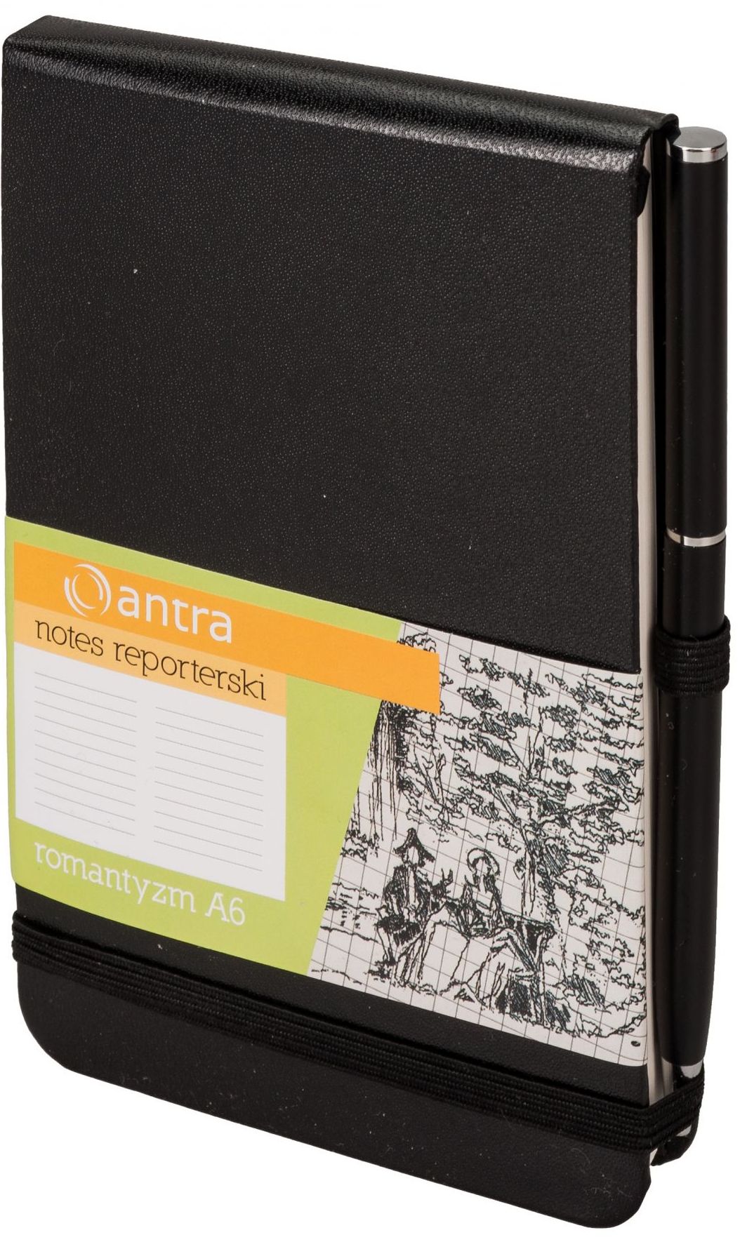 Oprawa twarda, ekologiczna z surowców naturalnych. Papier 80 g. Pierwsza i ostatnia strona notesu wykonana z ozdobnego papieru w kolorze czarnym. Koperta z tyłu na luźne karteczki. Specjalna gumka na długopis. Wstążka w kolorze okładki. Notes zamykany na gumkę.