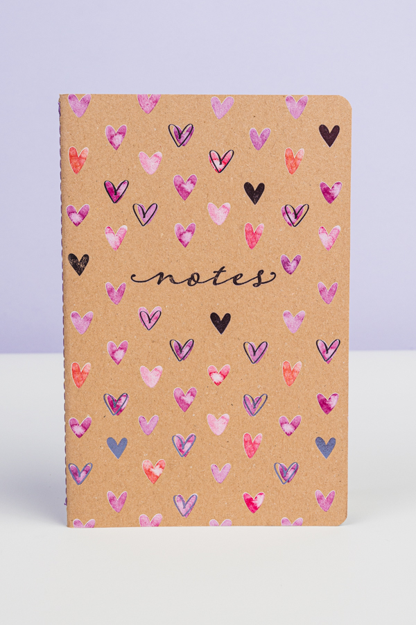 Okładki notesu z ilustracją kotów i serduszek oraz subtelnie tłoczone elementy grafiki i napisy, tworzą piękne zestawienie z naturalną tekturą. Kolor nici, pierwszej i ostatniej strony notesu uzupełniają stylowy wygląd notesu.