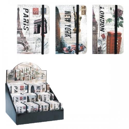 Praktyczny notes z gumką ozdobiony grafiką inspirowaną takich miast jak Londyn, Paryż, czy Nowy Jork. Notes dostępny w 3 rozmiarach A5 A6 i A7.