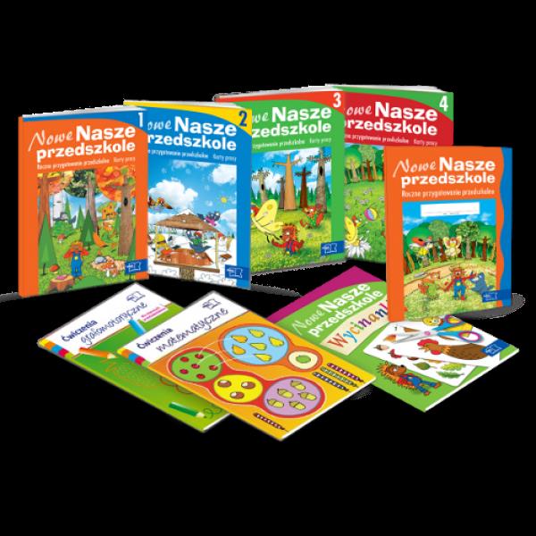 W skład pakietu Nowe Nasze przedszkole wchodzą: Karty pracy (4 części). Karty pracy to zbiór 4 części zawierający po 56-kart, które pomagają kształtować i rozwijać różne umiejętności, postawy w sposób ciekawy dla dziecka, systematyczny, oparty na aktualnej wiedzy z zakresu psychologii i pedagogiki. Wycinanki. Wycinanki to zbiór 48 prac oraz 8 wypychanek. Polecenia do każdej z prac znajdują się na końcu publikacji. Propozycje prac są skorelowane z tematyką zawartą w przewodnikach metodycznych. Ćwiczenia grafomotoryczne. Zbiór 48 kart, na których dzieci rysują po śladach, kreślą linie, wykonują szlaczki, piszą litery w zwiększonym formacie. Ćwiczenia matematyczne. 48 kart pracy zawierających propozycje ćwiczeń rozwijających umiejętności: szeregowania, klasyfikowania, liczenia, kształtujących pojęcia liczbowe. Dzieci, bawiąc się, ćwiczą umiejętność orientowania się na kartce papieru, koncentrację, spostrzegawczość, rozwijają intuicję geometryczna. Ćwiczenia są ukierunkowane na kształcenie umiejętności logicznego myślenia i stosowania matematyki w życiu codziennym.Całość publikacji zapakowana jest w funkcjonalną teczkę z gumką, która może być doskonałym miejscem na przechowywanie prac wykonywanych w przedszkolu
