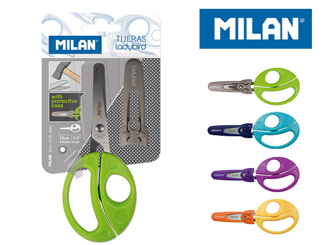 Nożyczki w kształcie biedronki o długości 15 cm. Ostrza ze stali nierdzewnej zaokrąglone na końcach z plastikową osłonką. Ergonomiczne, plastikowe uchwyty. Różne kolory.