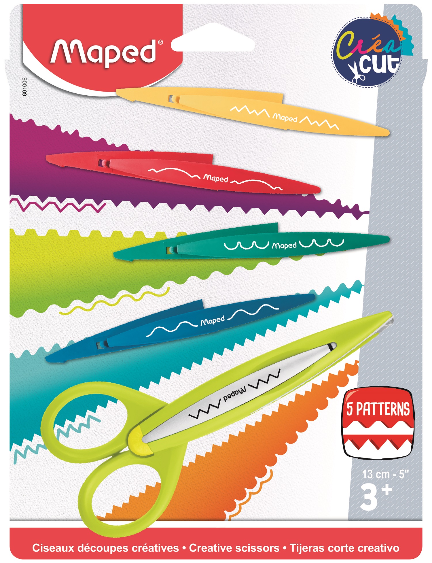 Plastikowe nożyczki kreatywne z 5 rodzajami wymiennych ostrzy do wycinania różnych wzorów. Doskonała zabawka rozwijająca zdolności manualne dzieci.