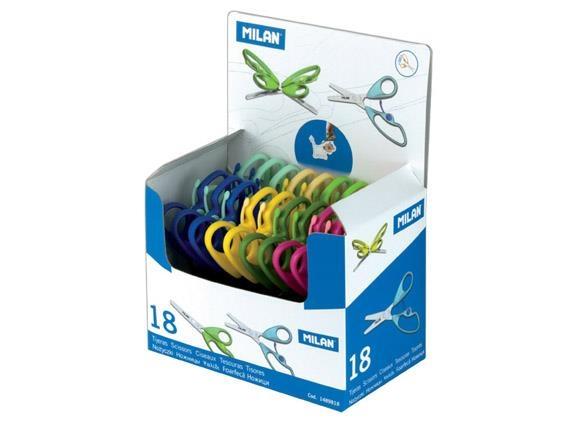 Nożyczki w kształcie motyla o długości 14,4 cm z amortyzatorem. Amortyzator ułatwia "otwieranie" nożyczek oraz zapobiega przycięciu sobie palca przez dziecko. Ostrza ze stali nierdzewnej zaokrąglone na końcach. Ergonomiczne, plastikowe uchwyty. Dostępne w 8 kolorach (mix).