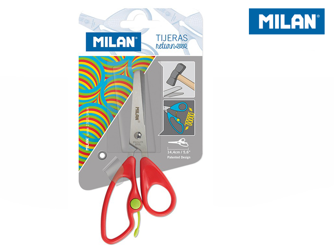 Nożyczki w kształcie motyla o długości 14,4 cm z amortyzatorem. Amortyzator ułatwia ""otwieranie"" nożyczek oraz zapobiega przycięciu sobie palca przez dziecko. Ostrza ze stali nierdzewnej zaokrąglone na końcach. Ergonomiczne, plastikowe uchwyty. Różne kolory.