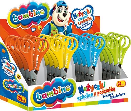 Nożyczki dziecięce z podziałką do użytku przedszkolnego, szkolnego czy domowego. Plastikowa, kolorowa, wygodnie wyprofilowana rączka idealnie pasuje do małych dłoni dziecka. Bezpieczeństwo użytkowania podnoszą zaokrąglone końce. Ekspozycję produktu w punkcie sprzedaży ułatwia estetyczny display zawierający 24 sztuki nożyczek. Licencja - BAMBINO