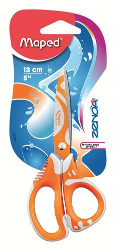 Ergonomiczne nożyczki z wyprofilowanymi, miękkimi w środku uchwytami. Asymetryczne. Zdobione ostrza i nit wykonane ze stali nierdzewnej. Dostępne w kolorach: pomarańczowym, niebieskim i rózowym.