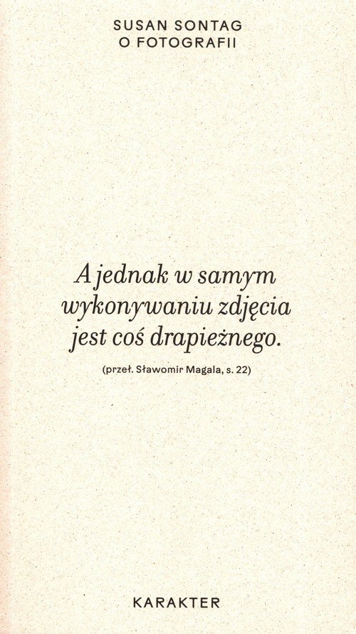 Nowe wydanie najważniejszej w historii książki poświęconej fotografii. Wybitna amerykańska intelektualistka bada znaczenie i funkcję fotografii we współczesnym świecie. Czym w swej istocie jest fotografia? Jakie są jej związki z malarstwem i sztuką? Jak zjawisko fotografii zmieniło nasz sposób postrzegania świata? W jakim stopniu fotografia interpretuje rzeczywistość? Jaka jest relacja między fotografem i obiektem oraz między zdjęciem a patrzącym? Na czym polega współczesny heroizm widzenia? Z jakich powodów sięgamy po aparat fotograficzny? Dlaczego skłonni jesteśmy przechowywać zdjęcia bliskich nam osób?