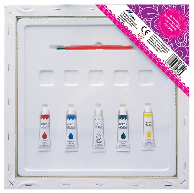 Zestaw zawiera: obraz zadrukowany wzorem kwiatow 30X30 cm, 5 kolorowych farb, pędzelek, paletkę