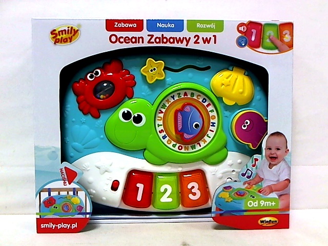 Zabawka gra melodyjki i miga światełkami. Ma wiele funkcyjnych elementów: min. grzechotki, lusterko.. . Ocean Zabaw można zamocować do łóżeczka. Po dołączeniu nóg jest stoliczkiem do zabawy w pozycji siedzącej.