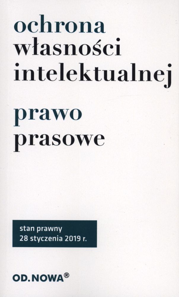 Kolejne wydanie zbioru przepisów niezbędnych do kompleksowego zapoznania się ze współczesnym stanem prawnym w dziedzinie ochrony własności intelektualnej. Polecany zwłaszcza studentom. Na zawartość tomu składają się ustawy: o prawie autorskim i prawach pokrewnych, prawo własności przemysłowej oraz prawo prasowe (uwzględniono zmiany, które weszły w życie nowelizacją z dnia 27 października 2017 r. Zaletą książki jest jej praktyczny, poręczny format, przejrzysty układ graficzny i niska cena. Łatwą orientację w materiale umożliwia obszerny skorowidz. Stan prawny: styczeń 2019 r.