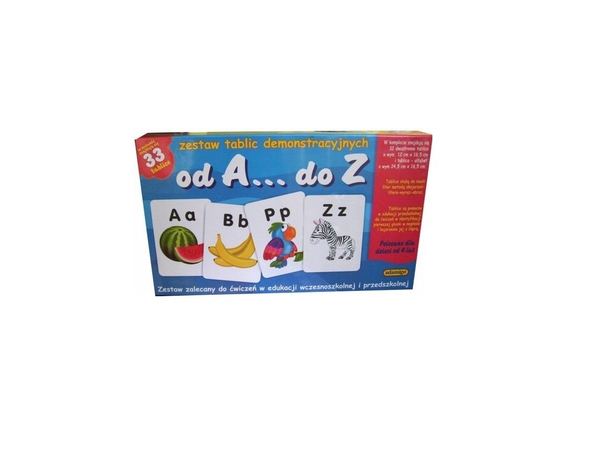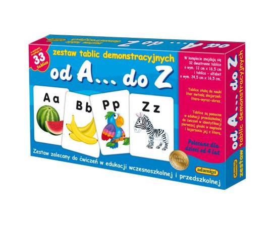 Zestaw tablic demonstracyjnych ”Od A… do Z” to wspaniała pomoc dydaktyczna przeznaczona dla dzieci, które poznają nowe litery i słowa. Tablice są bardzo trwałe i estetyczne, wykonane z grubego kartonu. Każda tablica przedstawia inną literę, z jednej strony znajduje się zapis litery oraz obrazek z podpisem, natomiast z drugiej – kilka innych wyrazów zaczynających się na tę literę i odpowiadające im obrazki.