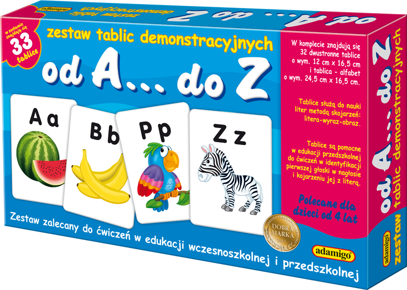Tablice służą do nauki liter metodą skojarzeń: litera – wyraz – obraz. Zestaw przeznaczony jest do ćwiczeń w edukacji wczesnoszkolnej i przedszkolnej, a więc w wieku, w którym dziecko najszybciej przyswaja wiedzę. Zestaw „Od A… do Z” ćwiczy pamięć malucha, ponieważ zaczyna ono kojarzyć kształt graficzny litery z konkretnym obrazem. Dzięki takiemu rozwiązaniu nauka czytania już nigdy nie będzie kojarzyła się Twojemu dziecku z przykrym obowiązkiem.