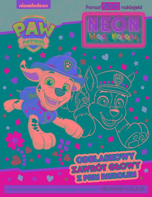 Psi Patrol. Neon Moc Koloru to książka z obrazkami oraz ponad 500 neonowymi naklejkami. W środku dziecko znajdzie strony z obrazkami do kolorowania oraz kreatywnego ozdabiania, dzięki czemu może tworzyć wyjątkowe prace. Każda strona to nowa przygoda z dzielnymi pieskami z Psiego Patrolu, a kolorowanie ulubionych bohaterów i wyklejanie stron neonowymi naklejkami to świetna zabawa. Efekt końcowy zaskoczy każdego malucha!