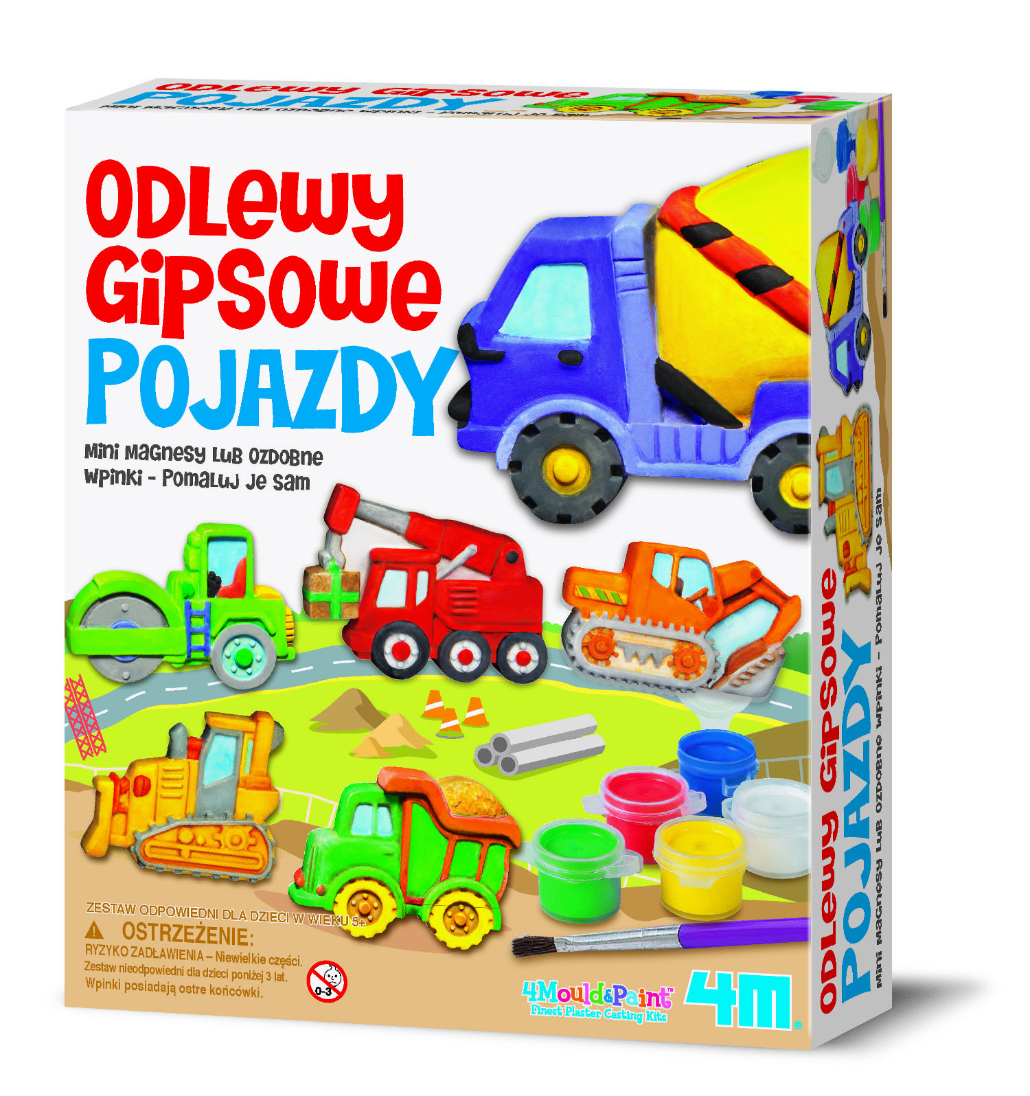 Zawartość: formy do wykonania 6 pojazdów, proszek gipsowy, magnesy, wpinki, pędzelek, pasek z 6 różnokolorowymi farbkami oraz instrukcja.