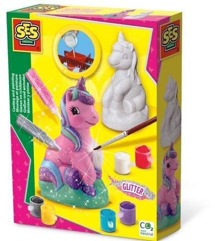 Popołudnie z castingiem i malowaniem z dziećmi! Zestawy do odlewania i malowania firmy SES Creative z pewnością zapewnią Ci dobrą zabawę i kreatywne rękodzieło! Dzięki temu zestawowi możesz zrobić kilka uroczych jednorożców za pomocą lateksowej formy. Formę można łatwo wypełnić gipsem i wodą. Gdy tynk stwardnieje, dzieci mogą wykazać się kreatywnością za pomocą pędzla i sześciu kolorów farby, aby stworzyć własne, niepowtarzalne gipsowe figurki. Klej brokatowy w dwóch kolorach doda Twojemu projektowi rękodzielniczemu blasku! Postępuj zgodnie z instrukcjami, aby stworzyć prawdziwe dzieła sztuki 3D.