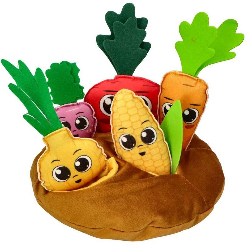 Ogródek Warzywny to urocza zabawka sensoryczna dedykowana dzieciom powyżej 9 miesiąca życia, stworzona z milutkiego weluru, zapewniającego dziecku przyjemne doznania dotykowe. W zestawie znajdują się 5 uśmiechniętych warzyw o różnych kształtach i kolorach, oraz kolorowy kopiec z dziurkami, uszytymi w tych samych kolorach co warzywa. Dziecko ma za zadanie posadzić warzywo w odpowiedniej dziurce na grządce, co rozwija jego małą motorykę oraz doskonali koordynację oko-ręka.