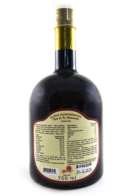 10 ml eliksiru (dwie łyżeczki) eliksiru spożyć rano po śniadaniu. Nie przekraczać zalecanej porcji do spożycia (10ml) w ciągu dnia (miarka w załączeniu). Preparat wystarcza na 3x 25 dni z 5 dniowymi przerwami.