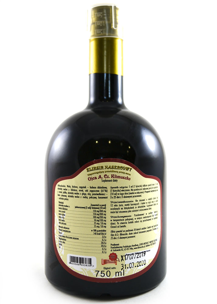 1 łyżeczka do herbaty (5 ml) eliksiru rano, po śniadaniu i wieczorem przed snem. Zalecana porcja produktu do spożycia w ciągu dnia: 10 ml. Nie przekraczać zalecanej porcji do spożycia w ciągu doby. preparat wystarcza na 3x 25 dni z 5 dniowymi przerwami.