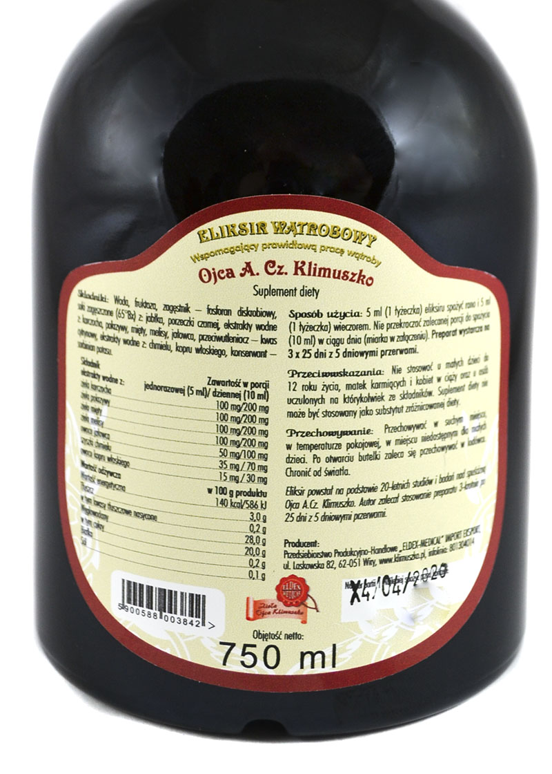 Eliksir powstał na podstawie 20-letnich studiów i badań nad spuścizną Ojca A. Cz. Klimuszko. Autor zalecał stosowanie preparatu 3-krotnie po 25 dni z 5 dniowymi przerwami.