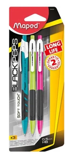 Ołówki automatyczne Black'Peps Long Life. Duża gumka o O 7,5mm. Wysmukły kształt. Wygodny, miękki uchwyt. Grafit 0,5mm HB, bardziej odporny na złamanie niż standardowe grafity. Intensywne kolory obudowy: niebieski, zielony, różowy. Blister 3 szt. JS 1 blister