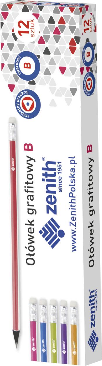 Drewniany ołówek grafitowy z gumką. Trójkątny przekrój prawidłowo kształtujący układ dłoni i ułatwiający naukę pisania, oprawa z czarnego drewna, lakierowana, różnorodne zastosowanie. Pudełko 12 sztuk, mix kolorów.