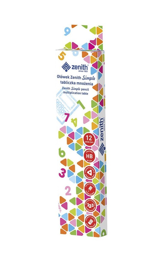 -Ołówek grafitowy z gumką Zenith Simple -Mocny i eleastyczny grafit -Wygodny, trójkątny kształtujący prawidłowy układ dłoni -Tabliczna mnożenia na ołówku -Twardość HB -12 sztuk w opakowaniu zbiorczym