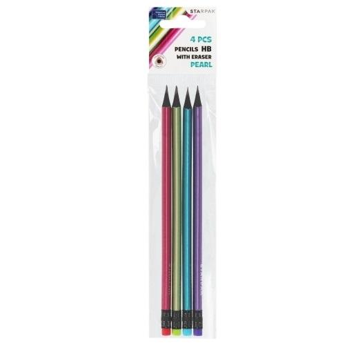 Zestaw 4 trójkątnych ołówków z gumką HB z kolekcji Starpak. Wykonany z trwałego drewna, zapewnia komfort rysowania i pisania. Ołówek nie łamie się podczas strugania, a gumka nie brudzi. Pakowany w folię z zawieszką.
