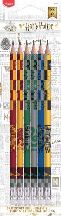 Ołówki drewniane z gumką z kolekcji Harry Potter. Twardość HB. Motyw <> bardzo modny i lubiany wśród nastolatków; wzory Gryffindor, Hufflepuff, Ravenclaw i Slytherin.