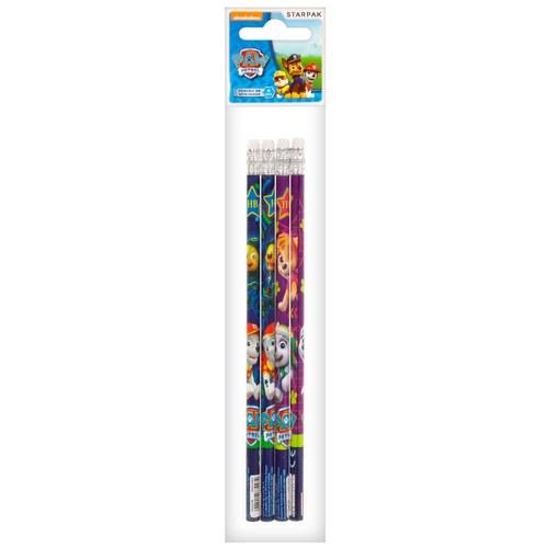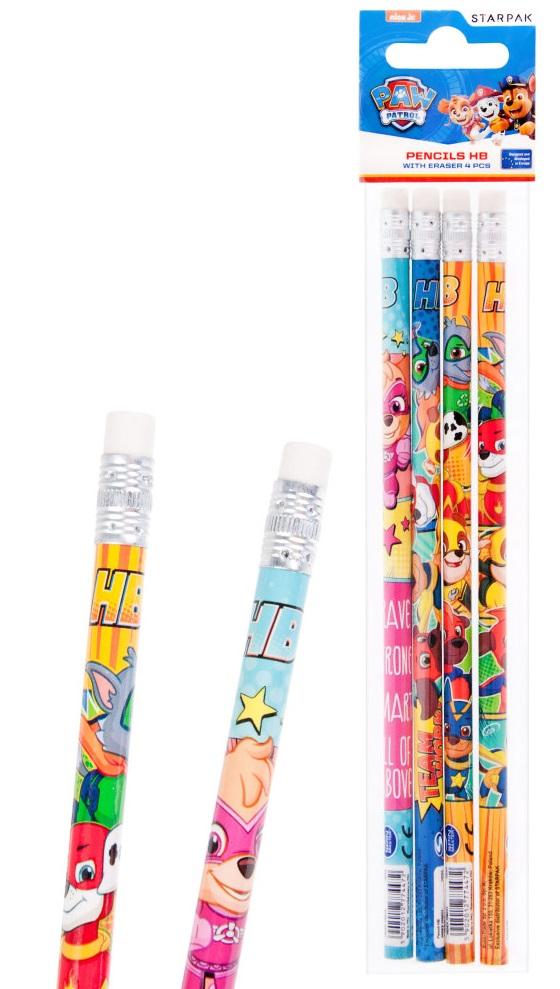 Zestaw 4 ołówków z gumką z kolekcji Starpak z licencją Psi Patrol. Każdy ołówek zdobiony kolorową grafiką z ulubionymi bohaterami. Wykonany z trwałego drewna, zapewnia komfort rysowania i pisania. Ołówek nie łamie się podczas strugania, a gumka nie brudzi.
