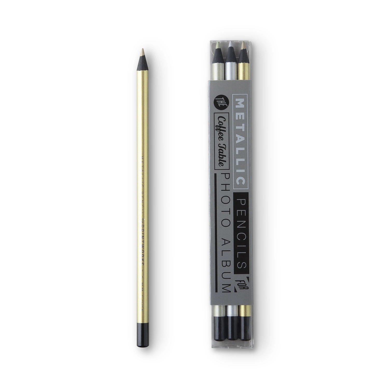 Zestaw 3 metalicznych ołówków do podpisywania zdjęć w Fotoalbumach marki PRINTWORKS. Ołówki mają wyjątkowo miękki rdzeń, dzięki czemu są przyjemne w użyciu. Ołówki mają rdzeń 3,0 mm i są wykonane z drewna lipowego dla wyjątkowej jakości.