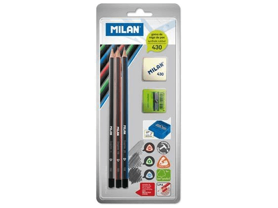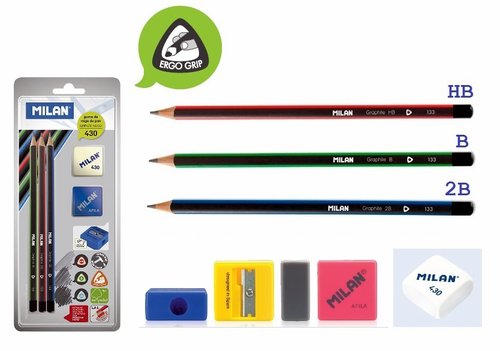 3 szt. ołówków trójkątnych z systemem ochrony rysika LPS zwiększającym odporność na złamanie. Grafit HB, B, 2B. Temperówka kwadratowa AFILA z bezpiecznym i wytrzymałym ostrzem ze stali węglowej. Doskonała do ołówków i kredek. Idealna do piórnika. 430: miękka gumka syntetyczna do ścierania większości rodzajów grafitu z każdego rodzaju papieru.