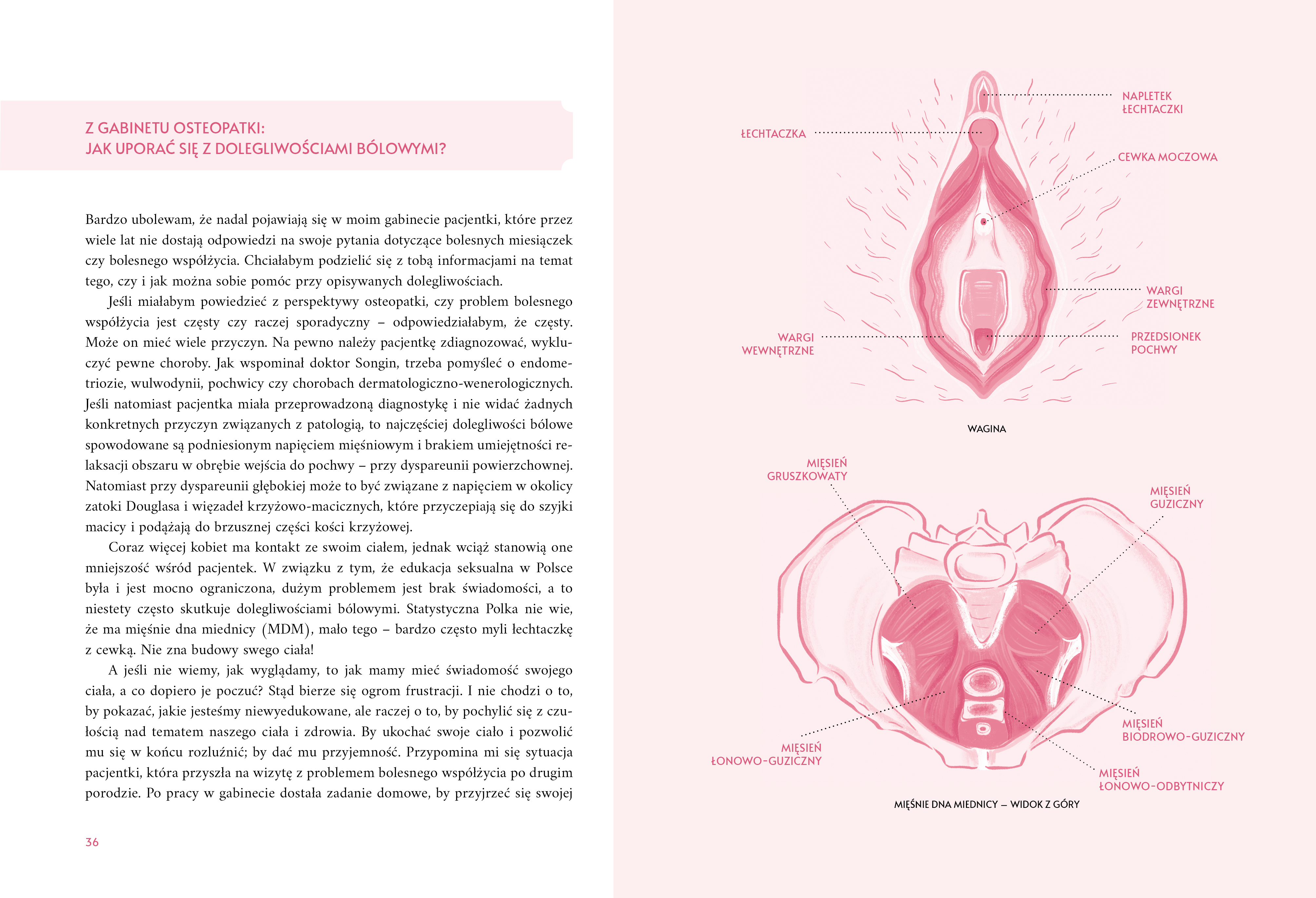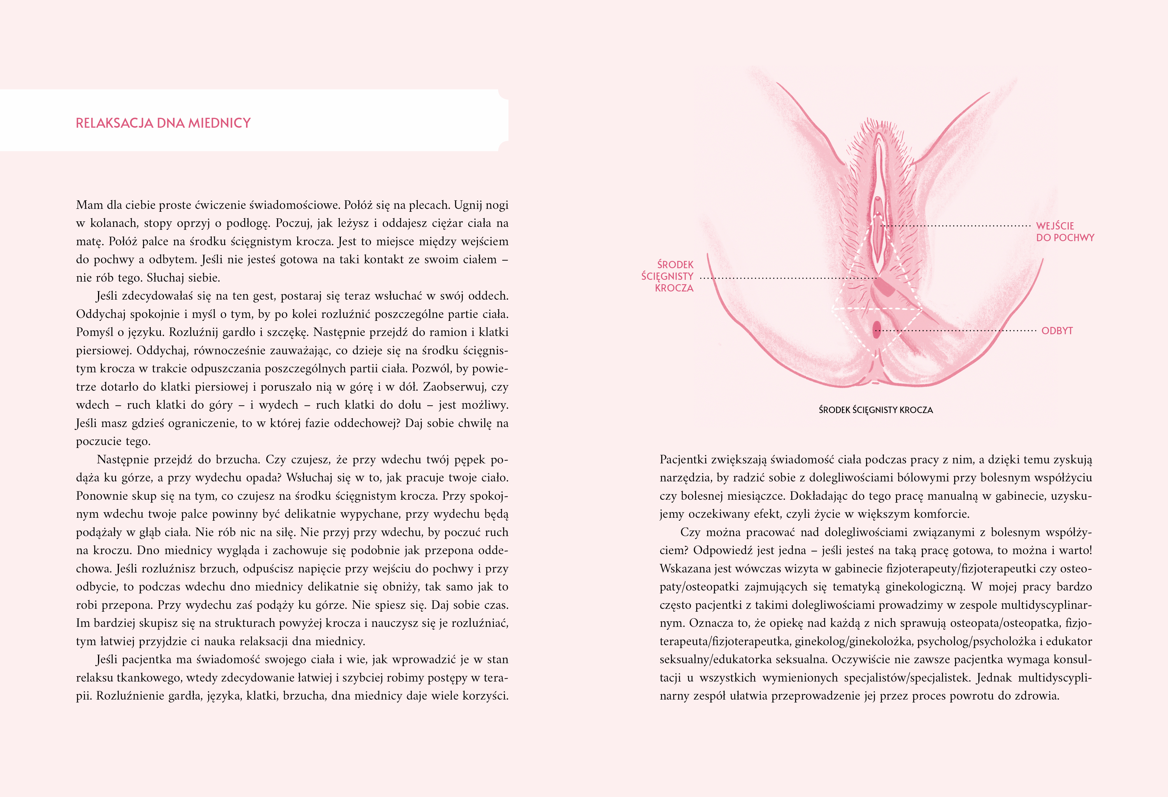 Wiele kobiet nigdy nie widziało swojej waginy, nie przeżyło orgazmu ani nie wie, gdzie ma mięśnie dna miednicy. Niejedna dała sobie wmówić, że ból miesiączkowy lub w trakcie współżycia to „taka pani uroda”. Wiele kobiet milczy w samotności, bo myśli, że tylko one tak mają… A jakie są twoje intymne problemy, o których wstydzisz się powiedzieć nawet przyjaciółce? Daj się poprowadzić Ewelinie Tyszko-Bury i Kamili Raczyńskiej-Chomyn, ekspertkom w dziedzinie zdrowia intymnego. Dowiedz się, co jest normą, a co powinno cię zaniepokoić, i kiedy trzeba udać się do konkretnego specjalisty. Naucz się, jak ćwiczyć i relaksować mięśnie dna miednicy (MDM), żeby zadbać o swoją postawę i… doznać jeszcze więcej przyjemności w łóżku. Przekonaj się, że możesz uniknąć PMS i mieć bezbolesne miesiączki. Pierwszy kompleksowy i nowoczesny poradnik o zdrowiu intymnym i seksualnym kobiet Ewelina Tyszko-Bury – osteopatka, fizjoterapeutka. Dzięki swojej pracy nauczyła się słuchać kobiecego ciała. Od dziewięciu lat zgłębia tajniki pracy z pacjentkami z problemami ginekologicznymi. Ma to szczęście, że kocha to, co robi. Kamila Raczyńska-Chomyn – edukatorka seksualna, instruktorka treningu mięśni dna miednicy, doula i autorka projektu Dobre Ciało, w ramach którego pomaga kobietom wrócić do siebie po trudnych zdarzeniach, takich jak poronienie lub doświadczenie przemocy, i na nowo cieszyć się własnym ciałem. Wspiera kobiety w poszukiwaniu przyjemności i radości płynących z eksplorowania seksualności. Gdy zaczynałyśmy wspólną pracę nad książką, wiedziałyśmy, że to będzie wspaniała przygoda, ponieważ przyjaźnimy się i współpracujemy ze sobą od 2016 roku, wspierając na co dzień kobiety w powrocie do zdrowia fizycznego i psychicznego po bardzo różnych doświadczeniach. Miałyśmy też jasną wizję tego, jak chcemy, by ta książka wyglądała. Zależało nam na przekazaniu ci wiedzy w przystępny, czuły sposób (dokładnie tak, jak robimy to, pracując w gabinecie) oraz na wyraźnym dwugłosie. Dlatego rozdziały autorstwa Eweliny Tyszko-Bury dotyczą kwestii medycznych, a jej rozmówczyniami i rozmówcami są lekarki oraz lekarze różnych specjalizacji. Natomiast rozdziały autorstwa Kamili Raczyńskiej-Chomyn odnoszą się do emocji, psychiki oraz zjawisk społecznych powiązanych z seksualnością i ze zdrowiem intymnym. Chcemy wyraźnie zaznaczyć, że nie było naszą ambicją stworzenie kompendium, w którym znajdziesz wszystkie – od A do Z – kwestie związane z twoją seksualnością i zdrowiem. Nie pisałyśmy na przykład o laktacji czy o depresji poporodowej, ponieważ doszłyśmy do wniosku, że na rynku jest już sporo publikacji wyczerpujących powyższe zagadnienia. Bardziej zależało nam na poruszeniu tematów, o których rzadko się pisze, oraz na pokazaniu ci (być może) nowej perspektywy, z której możesz spojrzeć na kwestie swojego zdrowia intymnego. (od Autorek) Problem bolesnych miesiączek i bolesnego współżycia bardzo często pojawia się jako temat konsultacji w gabinecie osteopatycznym. Mimo to może ci się wydawać, że tylko ty doświadczasz takich dolegliwości – bo w zasadzie ból miesiączkowy, który nie pozwala ci funkcjonować, jest przez społeczeństwo traktowany jako norma, a co do współżycia… przecież „wszyscy” uprawiają cudowny seks i nikomu niczego nie brakuje do szczęścia. Od razu wyprowadzę cię z błędu. Tak nie jest. Bardzo wiele kobiet boryka się z problemami bolesnego współżycia czy bolesnych miesiączek. Chciałabym, abyś po tej rozmowie była pewna, że miesiączka i współżycie nie muszą boleć. (fragment książki) Jako edukatorka seksualna i menstruacyjna oraz instruktorka treningu mięśni dna miednicy stykam się z tematem bolesnych miesiączek dość często. Zdarza się, że dorosłe kobiety dopiero na moich warsztatach dowiadują się, że miesiączka nie musi boleć, a jeśli boli, to ginekolog/ginekolożka powinni zgłaszane dolegliwości traktować poważnie.(fragment książki)