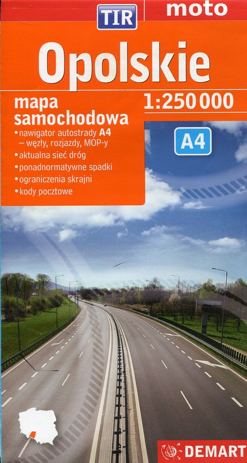 Mapa przeznaczona jest nie tylko dla kierowców zawodowych (TIR-ów, ciężarówek,) ale i dla wszystkich innych kierowców, którzy dużo jeżdżą po Polsce. Ma rozbudowaną treść tematyczną przydatną kierowcom zawodowym: - nawigator autostrady A4 (węzły, rozjazdy, MOP-y) - aktualną sieć dróg - ponadnormatywne spadki z opisem stopnia nachylenia - pionowe i poziome ograniczenia skrajni - spis kodów pocztowych Przedstawiona sieć dróg uwzględnia budowane odcinki: autostrad, dróg krajowych i wojewódzkich przewidzianych do użytku do końca 2013roku. Skala: 1:250 000
