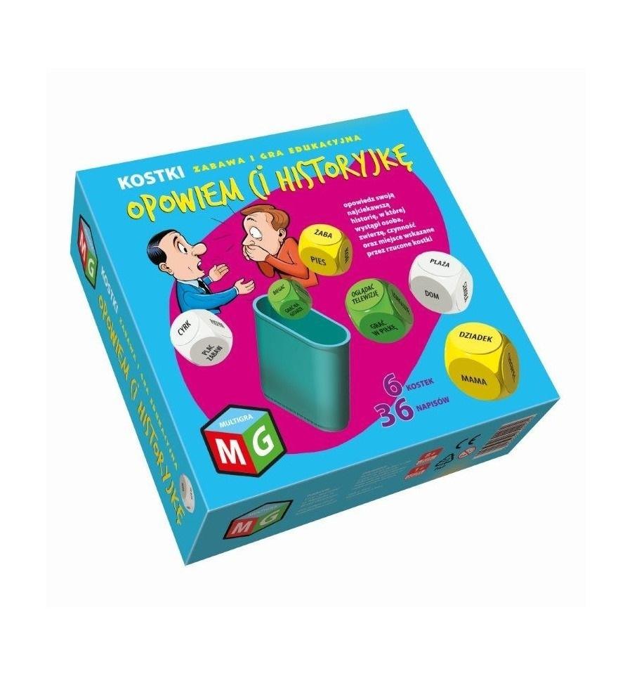 Kostki z wyrazami OPOWIEM CI HISTORYJKĘ to prosta ale bardzo ciekawa wymagająca kreatywnego myślenia zabawa i gra edukacyjna. Na 6 kostkach znajdują się wyrazy określające osobę, zwierzę, czynność i miejsce. Zabawa polega na tym, by po rzucie kostkami opowiedzieć historyjkę, która będzie zawierała wszystkie elementy wskazane przez kostki. Gra z użyciem kostek skierowana jest dla tych, którzy lubią wymyślać historię, ale i szybko pisać. Gra od zabawy różni się tym, że po rzucie kostkami gracze starają się jak najszybciej napisać swoją historyjkę z użyciem wyrazów znajdujących się na kostkach. OPOWIEM CI HISTORYJKĘ- kostki to świetna pomoc dydaktyczna, rozwija wyobraźnię, zmusza do myślenia i uczy poprawnego wysławiania się i pisowni. Zawartość pudełka: 6 kostek z obrazkami, kubek, instrukcja.