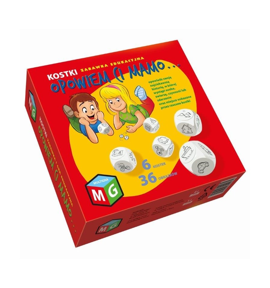 Kostki obrazkowe Opowiem Ci mamo to prosta ale bardzo interesująca i wartościowa zabawka i gra edukacyjna. Na 6 kostkach znajdują się symboliczne obrazki przedstawiające osobę, czynność, zdarzenie i miejsce. Zabawa polega na tym, by po rzucie kostkami opowiedzieć historyjkę, która będzie zawierała wszystkie elementy wskazane przez kostki. Zabawa może odbywać się w większym gronie, a każdy z uczestników w swojej kolejce stara się opowiedzieć jak najciekawszą historię. Zabawa stanowi świetną pomoc dydaktyczną, rozwija wyobraźnię, zmusza do myślenia i uczy poprawnego wysławiania się.