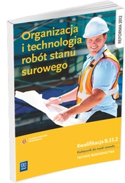 Podręcznik do nauczania w zawodzie technik budownictwa realizujący treści z zakresu kwalifikacji B.33. Organizacja i kontrolowanie robót budowlanych - B.33.2. Organizowanie i kontrolowanie robót budowlanych stanu surowego. W książce m. in. omówiono rodzaje fundamentów i sposobu ich wykonania, rodzaje ścian i organizację robót murowych, wykonywanie stropów, żelbetowe konstrukcje monolityczne i prefabrykowane, rodzaje schodów, konstrukcje dachów i stropodachów, pokrycia i obróbki dachów, rodzaje izolacji i sposoby ich wykonania, stolarkę i ślusarkę budowlaną, a także organizację tych robót. Omówiono też warunki techniczne wykonania i odbioru robót stanu surowego oraz warunki bezpiecznej pracy. Na końcu rozdziałów i działów znajdują się pytania, dzięki czemu uczeń może sprawdzić nabyte wiadomości, a także ćwiczenia kształtujace umiejętności.