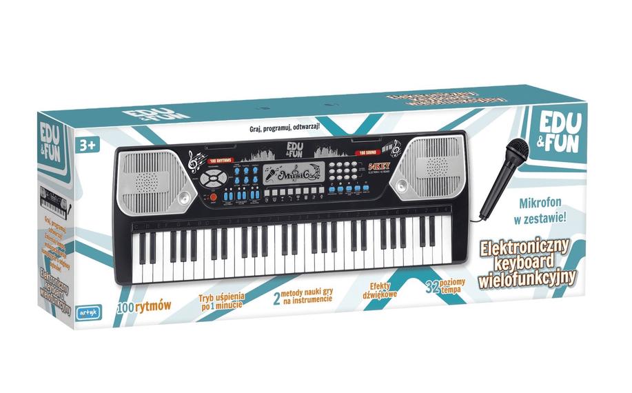 Syntezator z mikrofonem i 54 klawiszami funkcyjnymi.
