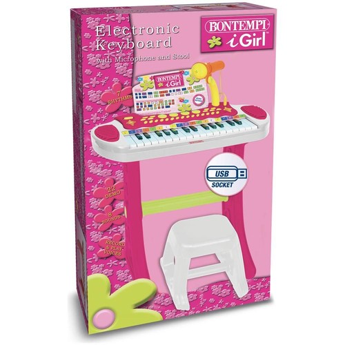 Organy elektroniczne włoskiej firmy Bontempi, to wymarzona zabawka młodego klawiszowca. Instrument zawiera: statyw do wysokości 61cm, 31 klawiszy, 22 melodie, 8 dźwięków, 7 rytmów, 4 dźwięki perkusyjne, funkcję nagrywana i odtwarzania, regulację głośności oraz tempa, efekty świetlne, funkcję automatycznego wyłączania, mikrofon oraz stołek. Wymiary produktu 45 x 48 x 65cm. Zasilanie 4xR6/AA 1,5V (nie dołączono do zestawu).