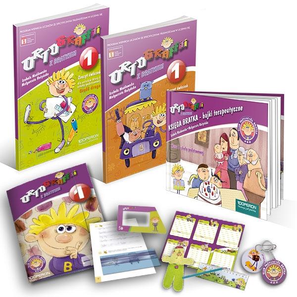 Seria ORTOGRAFFITI z Bratkiem dla uczniów klas I-III składa się z 6 zeszytów ćwiczeń, po 2 na każdy rok szkolny. Materiał ćwiczeniowy podzielono na jednostki, zwane blokami. W każdym zeszycie jest szesnaście bloków. Zestaw ćwiczeń zawarty w jednym bloku pozwala zrealizować zajęcia w wymiarze dwóch godzin dydaktycznych, z możliwością dostosowania do jednej godziny, jeśli jest taka potrzeba. Etapem wstępnym do pracy z ćwiczeniami jest bajka terapeutyczna (z ,,Księgi bajek terapeutycznych"", która jest nieodłącznym elementem pakietu dla ucznia i nauczyciela). Po wysłuchaniu bajki następują związane z nią ćwiczenia składające się na fazę organizacyjno-mobilizującą zajęć. W fazie drugiej (wypracowania gotowości do pracy) odbywa się usprawnianie funkcji ważnych w procesie uczenia się czytania i pisania: wzrokowo-przestrzennych, słuchowo-językowych i motorycznych. Podczas ,,pracy właściwej"" realizowany jest temat zajęć (na przykład ,,Głoska i litera ,,T"", ,,t""), zakończony ćwiczeniem relaksacyjnym. Blok kończy się podsumowaniem pracy i oceną wysiłku dziecka. Do każdego bloku zajęć przygotowano kartę pracy domowej i kartę postępów dziecka. Pierwsza z nich umożliwia kontynuowanie pracy w domu, a druga ma służyć nauczycielowi i rodzicom. Nauczyciel po zakończeniu zajęć ocenia pracę dziecka i odznacza to na karcie postępów dziecka. Dzięki temu rodzic jest na bieżąco informowany o postępach dziecka. Istotnym elementem Programu ORTOGRAFFITI z Bratkiem są bajki zebrane w księgę bajek terapeutycznych, oddzielną dla każdej klasy. Każda jednostka lekcyjna poświęcona realizacji Programu rozpoczyna się bajką czytaną przez nauczyciela. Po przeczytaniu następuje rozmowa na temat przeżyć dzieci związanych z jej wysłuchaniem, po czym nauczyciel zadaje pytania sprawdzające rozumienie tekstu. Wykorzystanie bajek ma na celu uspokojenie, zredukowanie problemów emocjonalnych i wspieranie dziecka w indywidualnym rozwoju emocjonalnym. Bajka jest bliska dziecięcemu myśleniu. Nie tylko usuwa wszelkie bariery dotyczące kontaktu z dzieckiem, ale przede wszystkim umożliwia skuteczne porozumiewanie się z nim. Główny bohater bajek - Bratek - jest niezastąpionym przyjacielem, znawcą dziecięcych potrzeb, marzeń. Uczy, a zarazem bawi. Zachęca do myślenia, refleksji, a innym razem podaje gotowe rozwiązanie. Duże znaczenie ma ukazanie uczuć wybranych bohaterów. Dzieci mają szansę osłuchać się z nazwami konkretnych uczuć, stanów emocjonalnych, kojarzyć je z konkretnymi sytuacjami związanymi z przeżyciami bohaterów. Zestaw ORTOGRAFFITI z Bratkiem zawiera między innymi dwie oryginalne pomoce terapeutyczne - suwak Pingwinek na ślizgawce oraz nakładkę na palce Spaceruch, zaprojektowane i sprawdzone w pracy z dziećmi przez Autorki ćwiczeń . Karty pracy, Karty pracy domowej oraz Karty oceny postępów ucznia to dodatkowe arkusze z zadaniami dla ucznia i informacjami dla rodzica od nauczyciela.