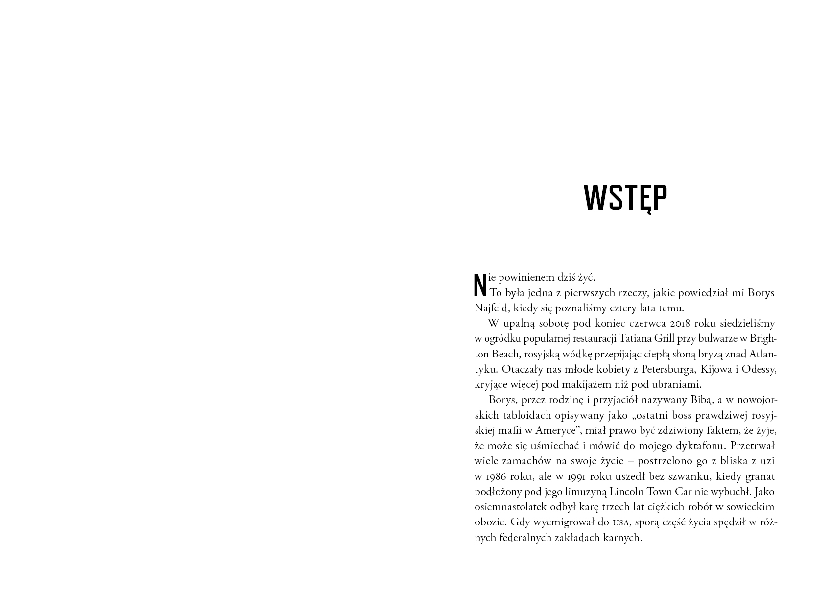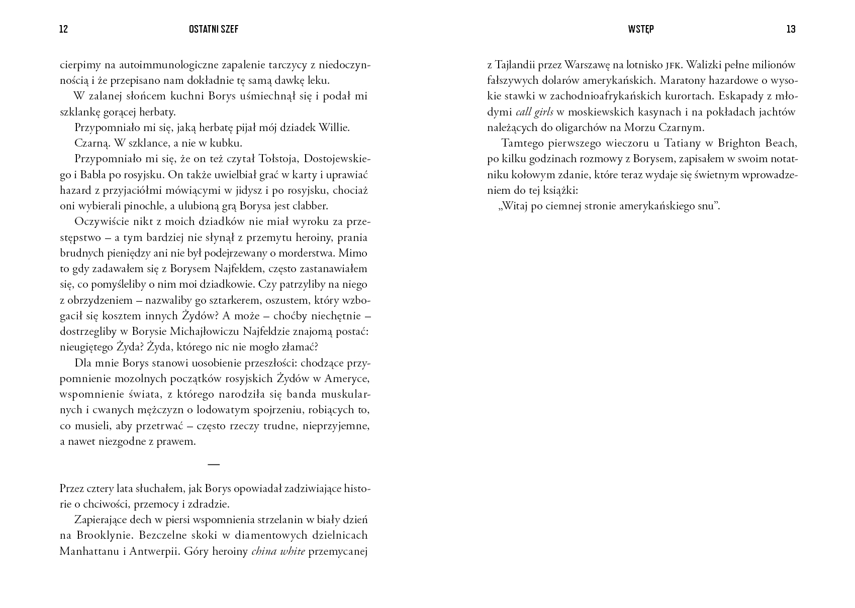 Historia ostatniego szefa prawdziwej rosyjskiej mafii w Ameryce. „Nie powinienem dziś żyć” – zaczyna swoją opowieść Borys „Biba” Nayfeld, twórca przestępczego imperium, które swoim zasięgiem obejmowało niemal cały świat. Opuszczony przez rodziców nastolatek z Homla w Związku Radzieckim trafił za chuligaństwo do kolonii karnej na Syberii. Nikt nie mógł przypuszczać, że właśnie tam zacznie się droga, która doprowadzi go do miasta największych możliwości: Nowego Jorku. Aponieważ nie miał nic do stracenia, był gotów na wszystko. Witajcie po ciemnej stronie amerykańskiego snu. Nayfeld rzucił wyzwanie zarówno FBI bezradnemu wobec jego finansowych przekrętów, jak i włoskiej mafii, która nigdy nie miała tak brutalnej i bezwzględnej konkurencji jak Rosjanie. A kiedy postanowił poszerzyć pole działania, sprzymierzył się z mafijnym bossem Ricardo Fanchinim – pierwszym gangsterem na globalną skalę, który… urodził się w Katowicach jako Marian Kozina. Dzięki tej spółce Warszawa stała się centrum przerzutu heroiny z Bangkoku do Ameryki. Ostatni szef to zaskakująca opowieść o chciwości, przemocy i zdradzie. „Fascynująca, krwawa i niesamowita historia Biby – inteligentnego, charyzmatycznego i brutalnego gangstera ze Wschodu, który wdarł się na szczyt nowojorskiego półświatka.” Filip Czerwiński, Mafia PL „Nie ma brutalniejszej organizacji przestępczej niż rosyjska mafia. Ta książka to wielka sprawa: zniewalająca, przypakowana, wciągająca i skazana na listy bestsellerów” agent specjalny ATF William Queen „Olśniewająca i przesiąknięta krwią biografia” „The Telegraph” „Fascynująca i wciągająca historia prawdziwego drania” „Kirkus Review”