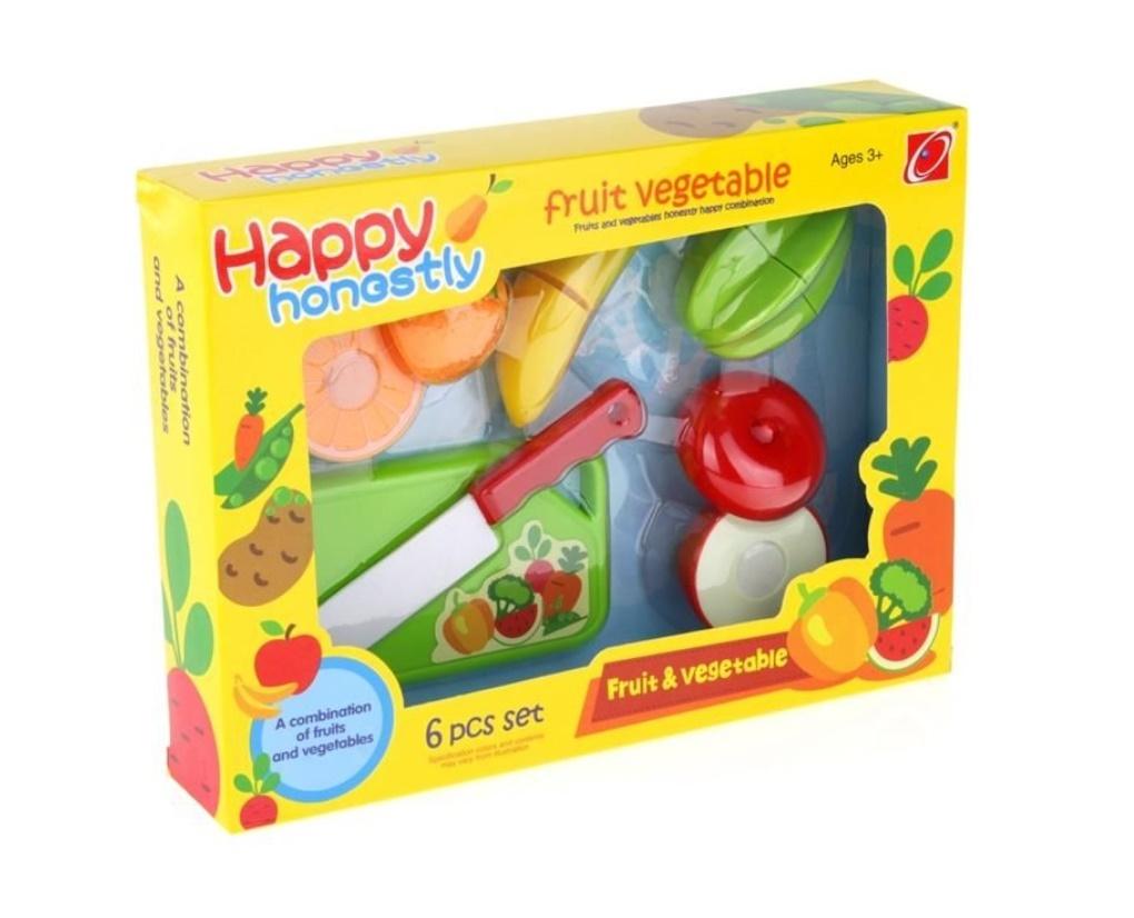 Owoce do krojenia z deską i nożem. Połówki przyczepiane są do siebie rzepami. W zestawie znajduje się 6 elementów: - owoce, składające się z 2 połówek: banan, pomarańcza, jabłko, karambola - deska do krojenia (13 x 7,5 cm) - nóż (14,5 cm)