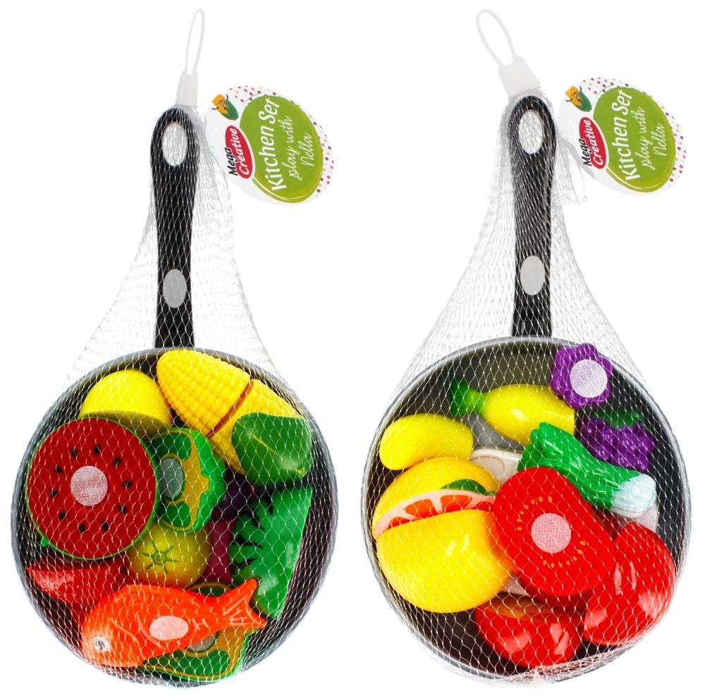 Zestaw zawiera: patelnię, arbuza, kukurydzę, cytrynę, paprykę, truskawkę, bakłażana, rybę oraz deskę i nóż do krojenia.