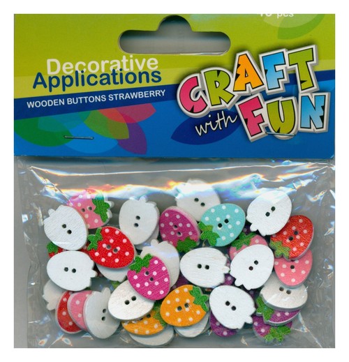 Ozdoba dekoracyjna guzik z drewna w kształcie truskawki. W opakowaniu 40 szt, mix kolorów.
