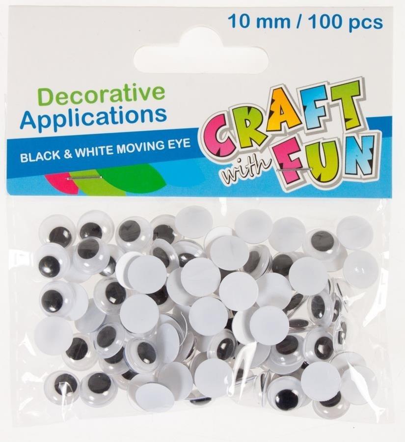 Opakowanie zawiera 100 samoprzylepnych naklejek Oczu z ruchomymi czarnymi źrenicami. Oczy o średnicy 10 mm. Wszystkie elementy wykonane z tworzywa sztucznego.